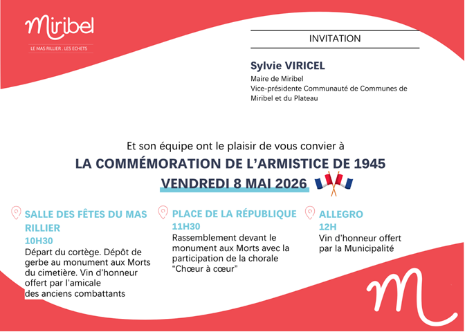 . à 11h30 à Miribel : dépôt de gerbes au Monument aux Morts Place de la République, avec la participation de la Chorale de Miribel «Chœur à Cœur », puis vin d’honneur à l’Allégro à 12h